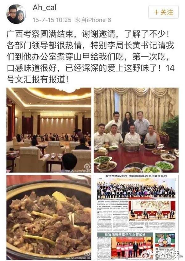 据微博注册信息显示该女为深圳某设计工程公司,具体职务不详,不过从其微博看出,穿山甲、蛇、天鹅甚至猫头鹰,一年进入肚子里的野生动物不少。