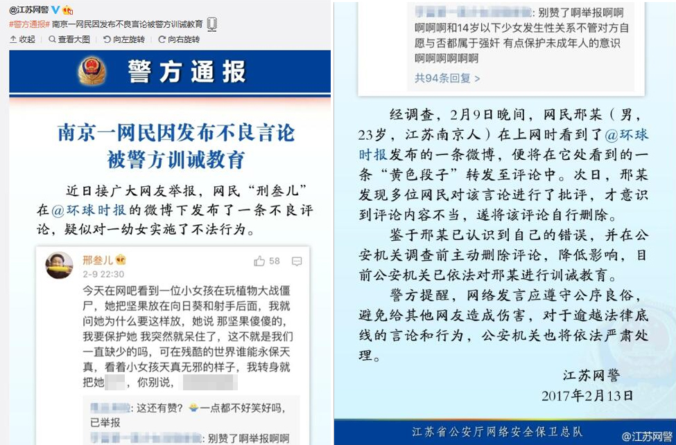 中国青年网北京2月13日电(记者 孙钊) 据江苏网警通报称,近日接到广大网友举报,微博名为名"刑叁儿"的网民,在环球时报的微博下发布不良评论,自称对一幼女实施了不法行为。经警方调查,网民邢某将看到的"黄色段子"转发至评论中,造成不良影响,该男子在公安机关调查前自行删除评论,目前警方已依法对邢某进行训诫教育。