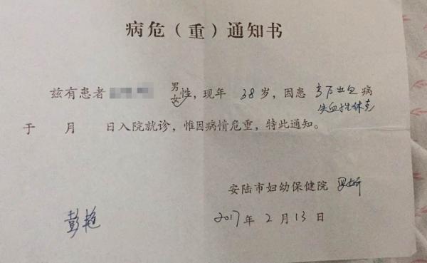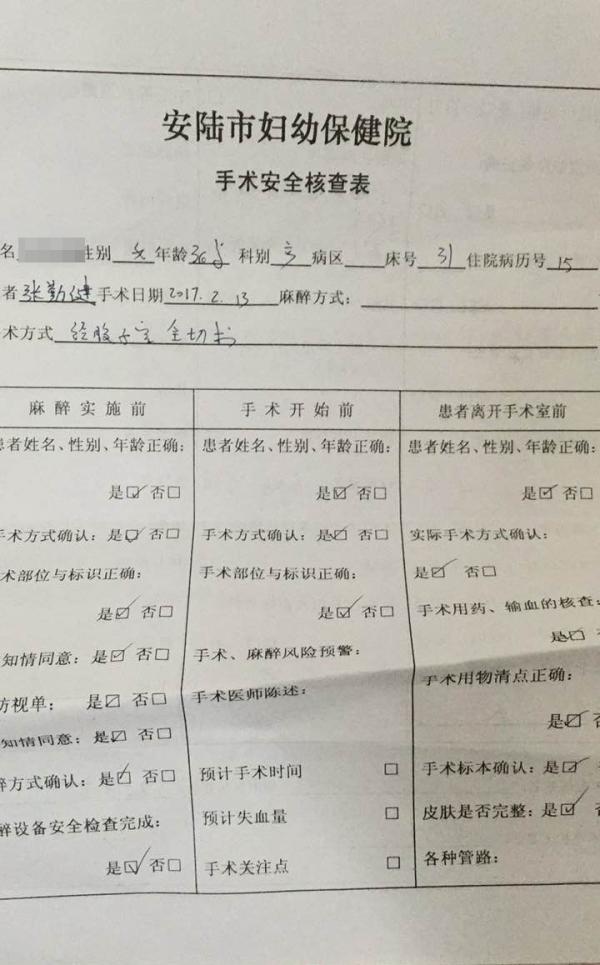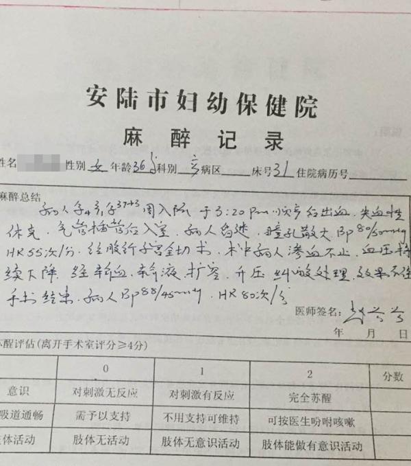 2月13日,安陆市妇幼保健院记录关于先女士的《手术安全核查表》以及《麻醉记录》显示,先女士于2月13日下午3时20分顺产后出血,失血性休克,病人昏迷,瞳孔散大。经子宫全切术,术中病人渗血不止。安陆市妇幼保健院2月13日下达的《病危(重)通知书》显示,先女士“产后出血、失血性休克”,病情危重。
