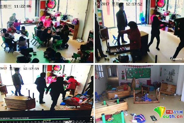 幼儿园内冲突现场画面。