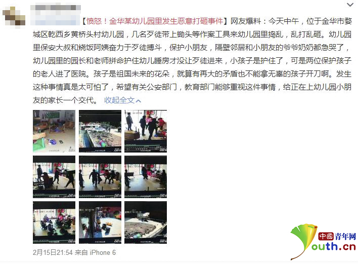 中国青年网北京2月16日电(实习记者 崔楠 记者 李永鹏)2月15日晚,有网友发微博称,当天中午浙江省金华市婺城区乾西乡黄桥头村幼儿园发生打砸事件,当时正值孩子们午睡,打砸场面被现场的监控视频拍下。2月16日上午中国青年网记者致电婺城区教育局,工作人员表示事件起因系冲突双方民事纠纷,幼儿园方面并无师生受伤,未来将会根据警方的调查结果,对受损物品的赔偿和当事人的处理进行处置。