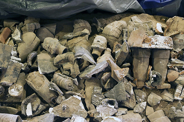 2017年1月12日,西安市临潼区溯源·秦皇陵景区,“山寨兵马俑”销毁后的碎片还留在坑里。(视觉中国 资料)