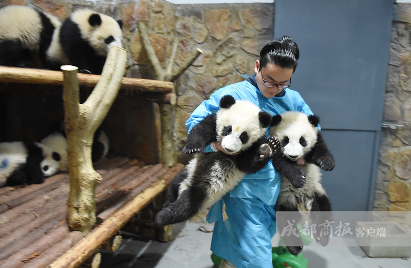 张粤在“搬运”熊猫宝宝 成都大熊猫繁育研究基地里,有这样一群被称作熊猫“奶爸”“奶妈”的熊猫饲养员,在熊猫迷眼里,他们干着的是一份让他们最羡慕的工作。成都商报记者日前用镜头走近熊猫饲养员张粤,记录下一名熊猫“奶爸”的日常。