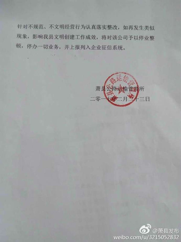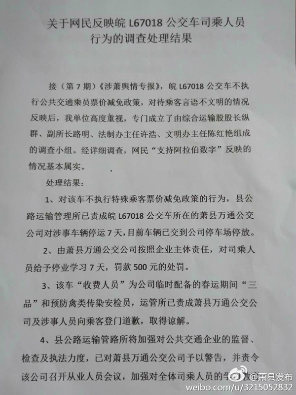 针对此事,2月23日,宿州市萧县互联网宣传管理办公室通过官方微博发布萧县公路运输管理所的《关于网民反映皖L67018公交车司乘人员行为的调查处理结果》通报:经详细调查,“支持阿拉伯数字”网民反映的情况基本属实。通报称,涉事的皖L67018公交车隶属萧县万通公交公司,其“收费人员”为公司临时配备的春运期间“三品”和预防禽类传染安检员,运管所已责任萧县万通公交公司以及涉事人员向乘客登门道歉,并取得谅解。