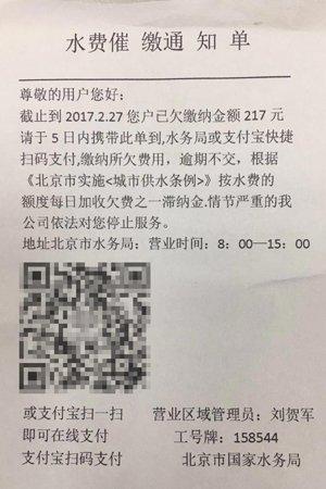 新京报快讯(记者信娜)近期,陆续有市民反应,有人在海淀、丰台等地的居民小区张贴假的水费催缴通知单骗取钱财。对此,市自来水集团今日表示,已配合支付宝冻结假冒通知单上的账号,正规的缴费通知单上应包含用户编号、地址、用水量和水费金额等信息。