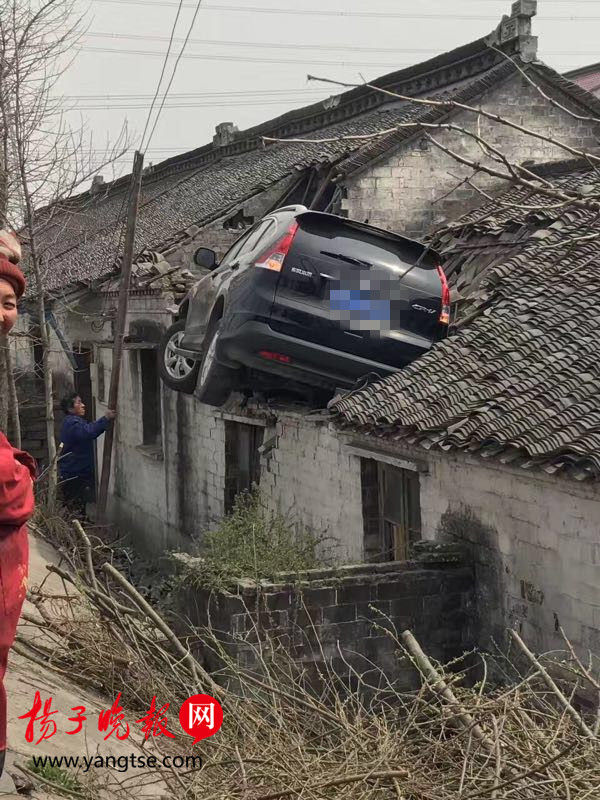 扬子晚报网3月10日讯(通讯员宏伟记者王国柱) 3月10日中午12点左右,泰州泰兴城黄路发生一起离奇车祸,一辆SUV越野车为避让三轮车后失控,一下子飞上路边3米高房子的屋顶。