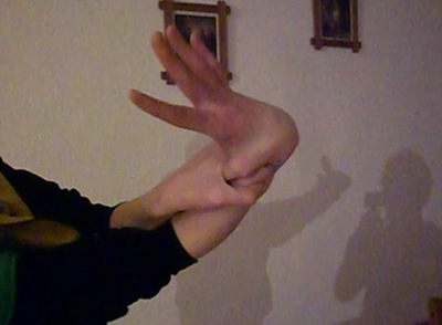 视频中,一名男子将右手放在白色的桌布上开始旋转起来,在旋转到一半后又借助左手的推力完成了右手掌的360度旋转,接着便放松使手掌回归原位。随后,该男子向网友们展示了其手掌的灵活性,大拇指非常柔韧可大幅度向后弯曲,整只手柔若无骨。