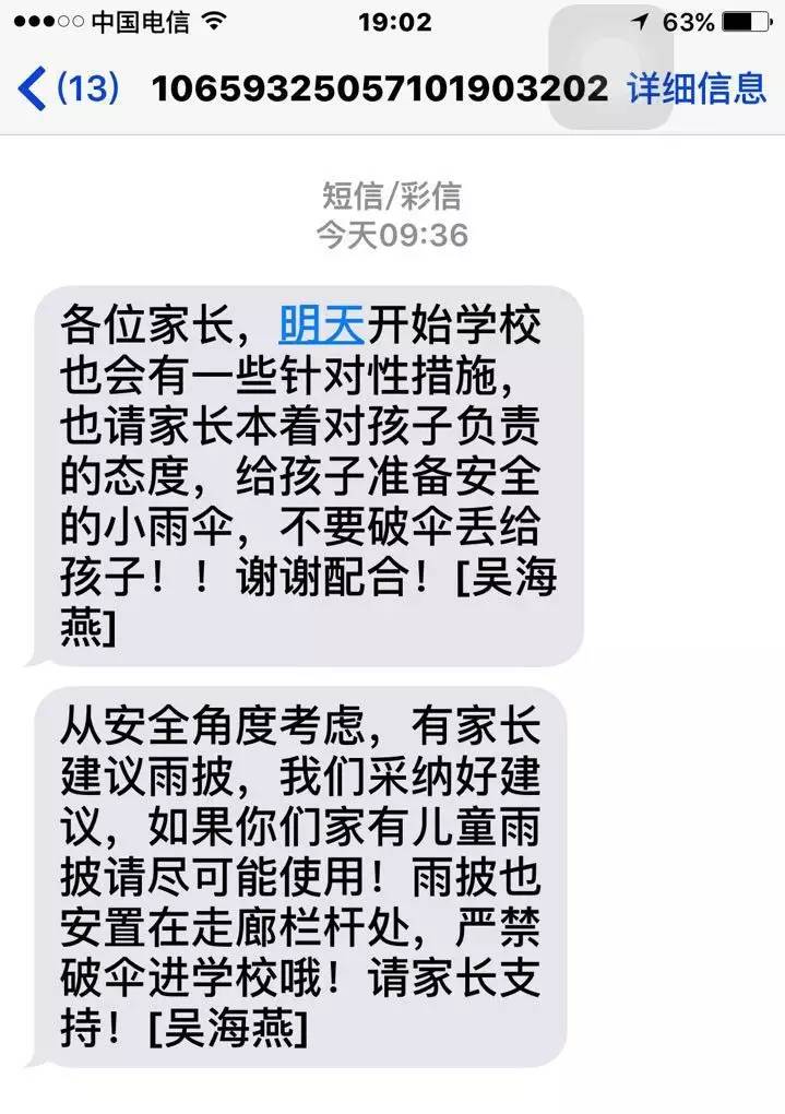 吴海燕向家长发送的短信截图