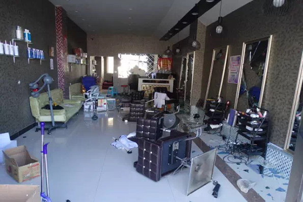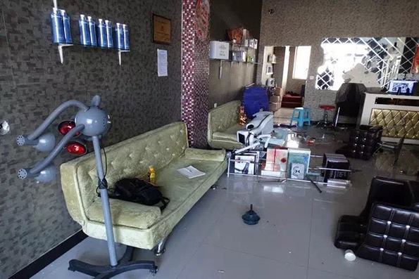 被砸的理发店。通辽市公安局供图据刘某交代,案发前她与好友韩某、乌某一起喝酒。酒后的刘某想到一年前,曾怀疑其男友与理发店老板有不正当关系,心有不甘,便约韩某一起去泄愤。13日凌晨1时许,两人进入理发店内将桌椅、理发用具踢倒,并用水泥块将店内的玻璃和镜子砸碎。后二人又在砸碎的镜子边上写下泄愤的话,直到乌某赶到店内,才把两人劝走。