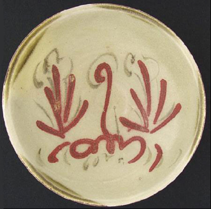 “黑石号”沉船中长沙窑青釉褐红彩花草纹瓷碗。齐东方介绍,“长沙窑已经有带红彩的,这算是一个信号,说明中国人对于釉色的掌握已经达到一个新的高度。”