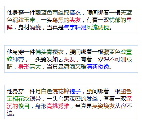 更复杂些,诸如生成一段描述古代女子外貌的文字,则是大量同类型词在固定公式里的应用,如公式:“她有着{空缺词},身穿一件{空缺词},逶迤拖地{空缺词},身披{空缺词}”,就能生成出“她有着粉红的鸭蛋脸,身穿一件暗纹刻丝黄玫瑰纹样花软缎薄衫,逶迤拖地刺绣纹绣裙,身披玫瑰粉三镶盘金如意纹花软缎。”