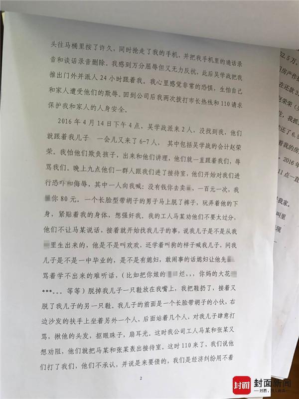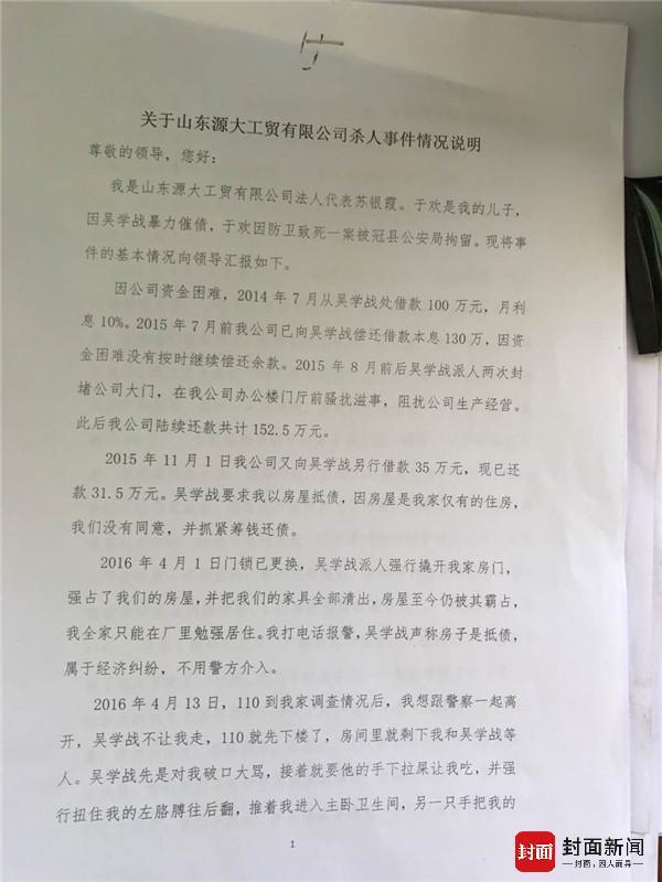 3月26日,封面新闻-华西都市报记者来到“刺死辱母者”案发现场——山东源大工贸有限公司,在公司传达室的于欢姑妈于秀荣向记者提供了一份《关于山东源大工贸有限公司杀人事件情况说明》的打印材料。