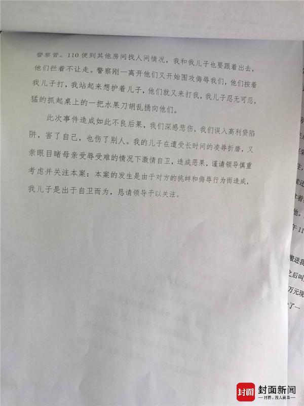 在这份情况说明中,苏银霞除了详细描述当日情况外,并称:“此次事件造成如此不良后果,我们深感悲伤,我们误入高利贷陷阱,害了自己,也伤了别人。我的儿子在遭受长时间的凌辱折磨,又亲眼目睹母亲受辱受难的情况下激情自卫,造成恶果,谨请领导慎重考虑并关注本案:本案的发生是由于对方的挑衅和侮辱行为而造成,我儿子是出于自卫而为,恳请领导予以关注。”