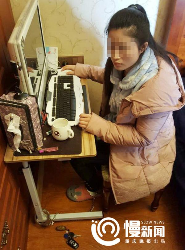 警察前来解救任欣时,她正背铐在电脑桌边,与网友聊天。