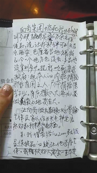 她心里有些慌乱,平生第一次翻了陈正林的包,钥匙、证件、笔记本都在,笔记本中间有一张纸,戴上老花眼镜后只看到遗书两个字就再没往下看,赶紧打电话给女儿陈力,“陈力陈力,你爸写遗书”。