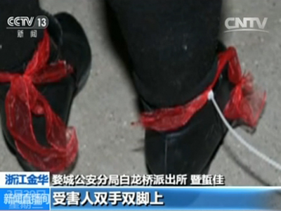 婺城公安分局白龙桥派出所 暨蜇佳:受害人双手双脚上都有绑带,被绑带勒得很深、很红,情绪非常激动,甚至有些恍惚,我们询问了之后,她自己描述,被三名嫌疑人绑架到车上,还喂食了一瓶不明液体。喝了这瓶不明液体之后,出现了昏睡的情况,可能是对不明液体有一些不良反应。