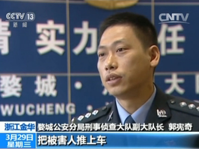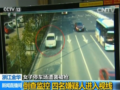 婺城公安分局刑事侦查大队副大队长 郭宪奇:一个人从被害人后面把被害人推上车,推到驾驶座,另外一个进副驾驶座,把她拉进去,还有两个人从车的后面进她的车,把她拽到后排,把她按在前排后排中间地方。按在那个地方之后,就把她的手脚捆住,用捆扎带捆住,把嘴巴封住。