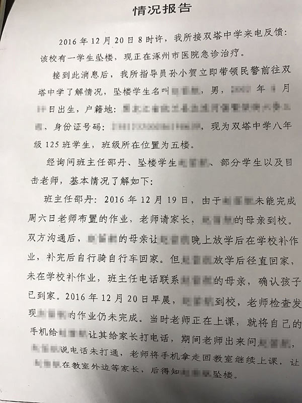 双塔派出所向澎湃新闻出具的《情况报告》显示,2016年12月19日,由于赵航未能完成周末作业,班主任邵丹请其母亲李某到校。双方沟通后,李某让赵航晚上放学后在校补作业,但赵航放学后径直回家。次日,邵丹发现赵航作业仍未完成,便让其打电话叫家长,此后发生了“坠楼”一事。