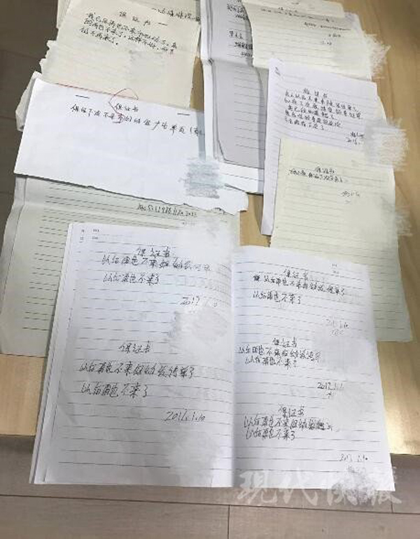 3月29日下午,现代快报记者在南京市妇幼保卫科看到了一份保证书,上面写着“下次不来妇幼做医托了。” 落款是一名王姓女子,时间是3月26日。保卫科的工作人员介绍,这张保证书出自那天被骆护士抓住的绿衣女子之手。 记者注意到,在这张下面,还有一张保证书,落款同样是该王姓女子,时间更早些,是2016年12月,当时她用一连三个“再也不”保证说:“以后不来妇幼保健院骗人,再也不来妇幼保健院骗人,再也不做医托。”