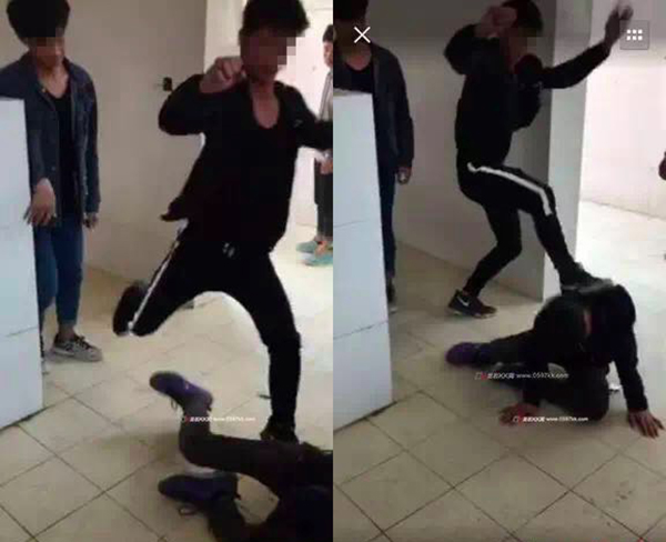 一段目击者拍摄的现场视频显示,一群男生在厕所内将一蓝色上衣的男生围住,蓝衣男生被摔倒在地,随后3名男生用脚踢向其身体和头部。围观者大喊“镜头不完整诶,这边来”,有人叫着“开始”,并继续殴打蓝衣男生。其间,一群人围上来一边踢一边质问“谁让你偷手机的”。