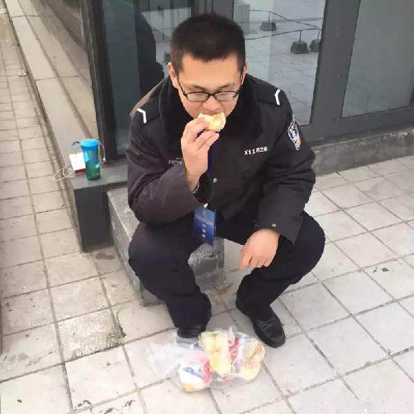 在执行上海合作组织峰会安保任务期间,张勇抽空用简单工作餐。
