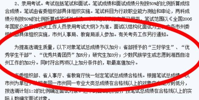 2007年1月16日公布的《湖南省2007年选调生选拔工作公告》中,详细规定了笔试总成绩的加分项、分值:省部授予的“三好学生”“优秀学生干部”“优秀共青团员”加5分;研究生加3分;少数民族学生或志愿到湘西土家族苗族自治州工作的加2分。同时符合两项以上加分条件的,取最高值加分。