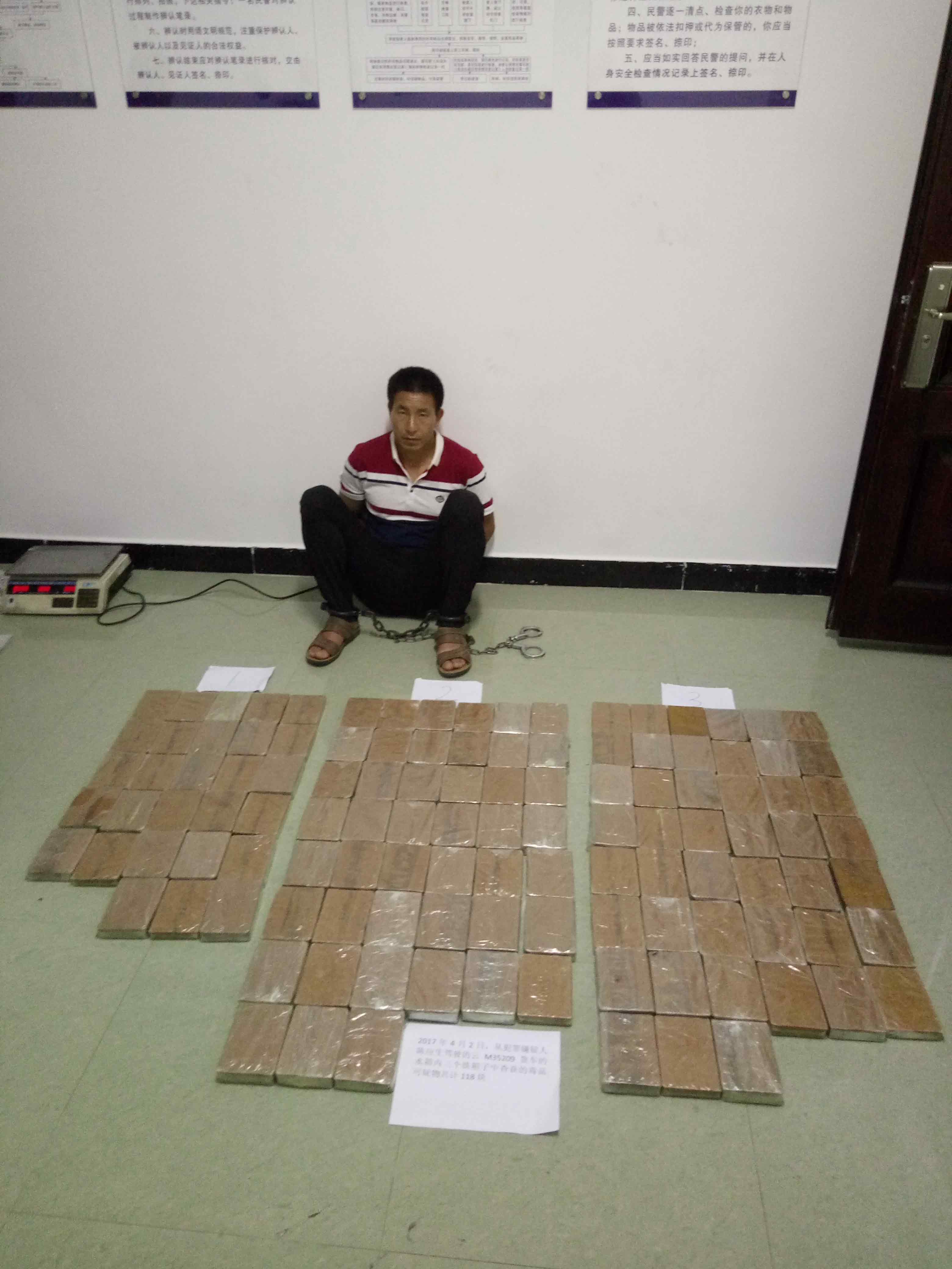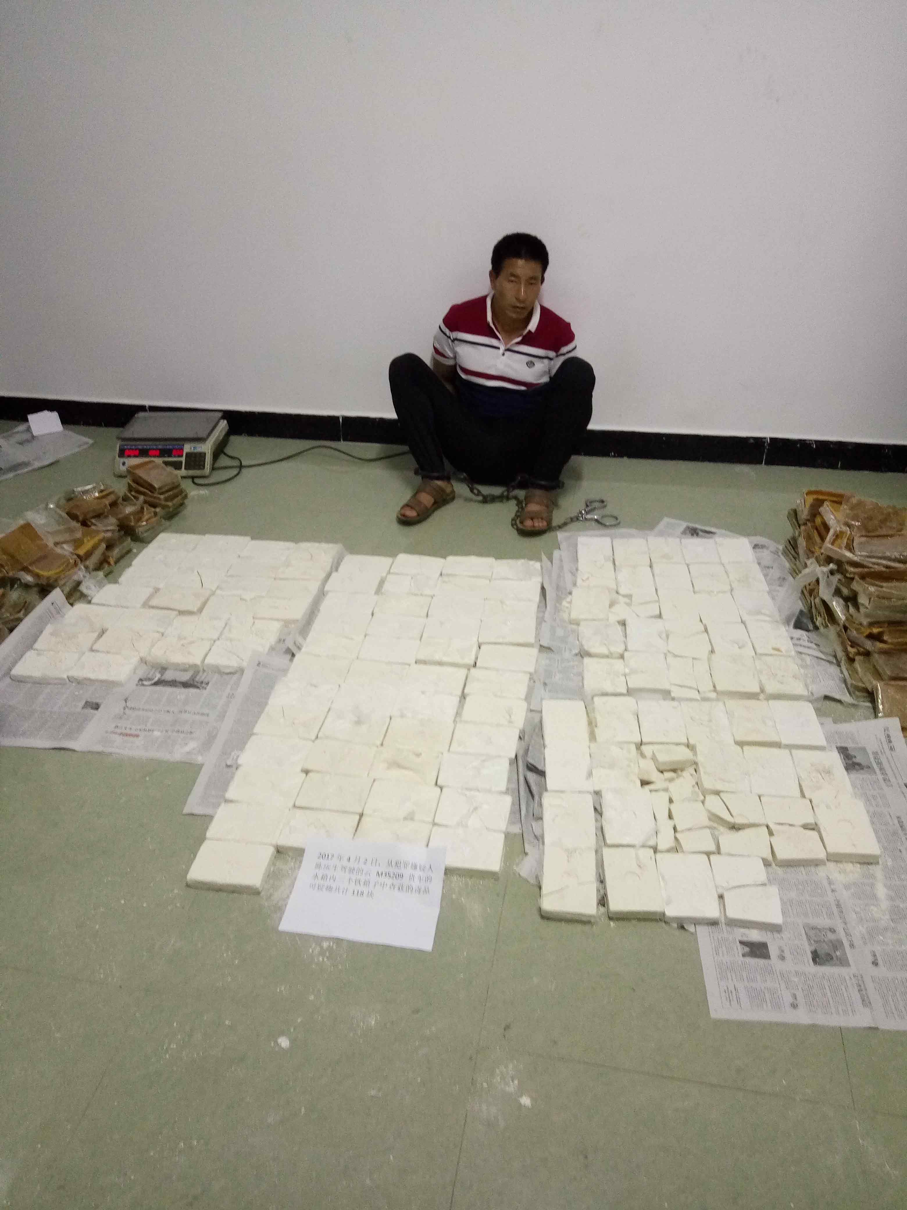 经现场清对,3个铁箱中共装满了用透明塑料袋和褐色纸包裹的毒品海洛因118块,净重41.411公斤。