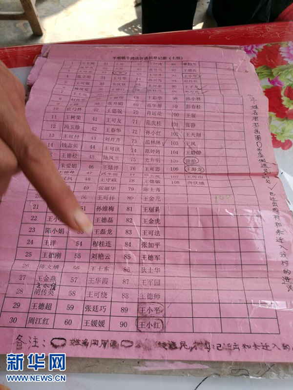 村民列举选民登记册中涉嫌造假的人员。 本文图均为 新华网 图发现:3年前的“假名单”又出现在选民名单中