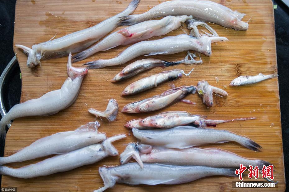 2017年4月9日,浙江省绍兴市上虞区,一市民从菜场购买来十条豆腐鱼,在清理鱼内脏时发现,十条鱼里有五条鱼拥有“腹中鱼”。而且很多鱼肚子里不止一条鱼,最多的一条鱼腹中有大大小小四条小鱼。图片来源:视觉中国