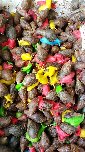 赤橙黄绿颜色各异,近日,在成都的宠物市场上,这些染得跟“杀马特”一样的蜗牛,已和大家印象中的蜗牛相去甚远。不过,一些商家甚至说这些蜗牛都是自然颜色,并因此热销。蜗牛成了一些市民的“新宠”,一些小学生更是对这些蜗牛爱不释手,一边饲养,一边写观察笔记。