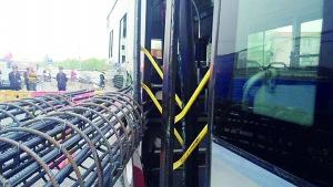 前天下午4时许,大兴区旧宫镇发生一起交通事故,一辆公交车与一辆拉钢筋的三轮车相撞,三轮车上的钢筋插入公交车中部(见图),扎入一名男性乘客的右腿。消防救援人员和120医护人员在现场救援一个多小时后,男子才脱险被送往医院。