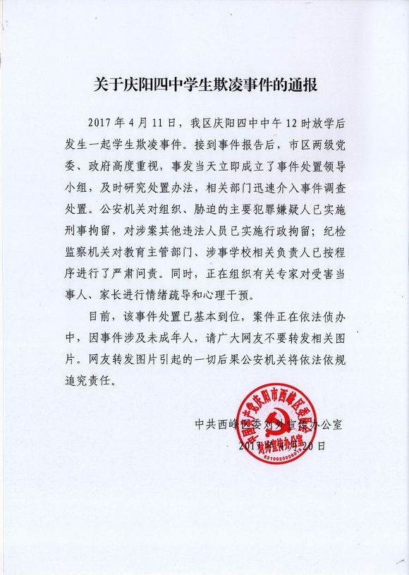 通报称,2017年4月11日,西峰区庆阳四中中午12时放学后发生一起学生欺凌事件。接到事件报告后,市区两级党委、政府高度重视,事发当天立即成立了事件处置领导小组,及时研究处置办法,相关部门迅速介入事件调查处置。公安机关对组织、胁迫的主要犯罪嫌疑人已实施刑事拘留,对涉案其他违法人员已实施行政拘留;纪检监察机关对教育主管部门、涉事学校相关负责人已按程序进行了严肃问责。同时,正在组织有关专家对受害当事人、家长进行情绪疏导和心理干预。