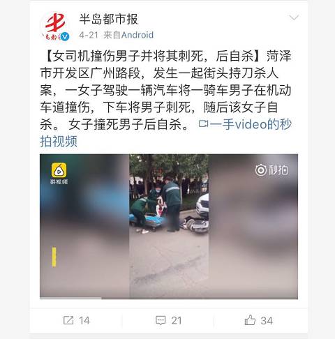 据山东省菏泽市公安局开发区分局消息,4月20日18时许,在山东省菏泽市开发区广州路,李某某(女,巨野县人)驾驶汽车将郭某某(男,牡丹区人)撞伤后又将郭某某刺死,然后自杀,送医院抢救无效于当晚20时许死亡。目前,案件正在进一步调查处理中。