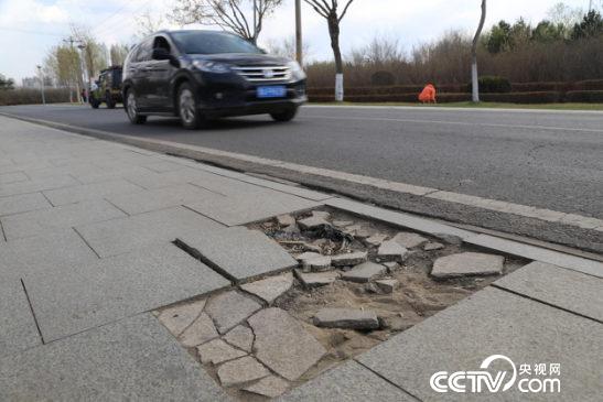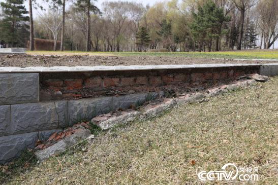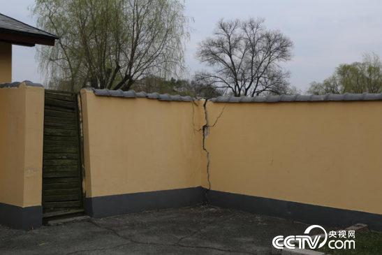 现象:新瀉友谊园入口处,围墙拐角从上裂到下,两面围墙向里倾斜,带动旁边一个木门变形。园内男厕旁边一个大坑,露着铸铁管道,无围挡和警示。