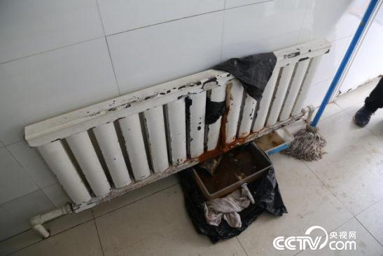现象:非收费区夏花园附近公厕,暖气漏水,用一大一小两个塑料容器接着。