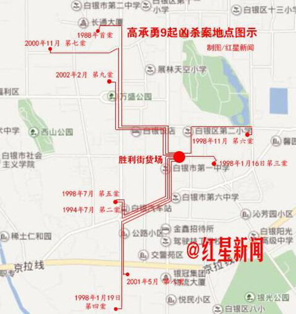 4月25日,红星新闻记者再赴甘肃白银,试图还原高承勇行凶前后发生的故事,结果发现,高承勇在白银犯下的九起命案有一个共同特点:所有凶案均以胜利街货场为中心,案发地点距此最近300米,最远1800米。