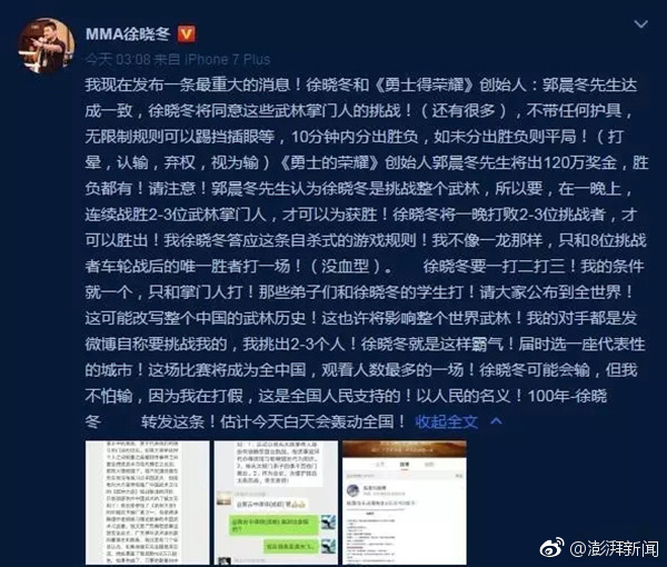 而在此之前,崆峒派弟子秦玉龙向徐晓冬发去战书:“无限制格斗,死伤由命!”