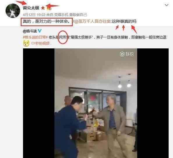 做为雷公太极创始人之一的雷雷,居然相信“闫芳”隔空打人是真实的,被网友戏称为男版的“闫芳”通过雷协微博发现,有粉丝将“闫芳”视频发给雷雷,并询问其观点,令人意外不到的是,雷雷居然认为隔空打人是真实存在的。