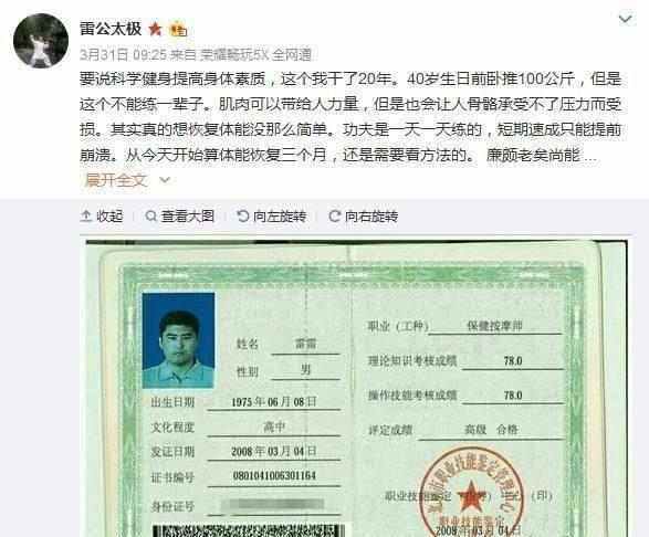 在雷公太极官网微博显示,雷雷自称拥有20年的健身经验,在微博中称40岁卧推100公斤,但是这个不能练一辈子。同时雷雷还晒出了高级保健按摩师的证书,证书显示雷雷2008年3月4日获得证书,职业为保健按摩师,文化为高中文化。