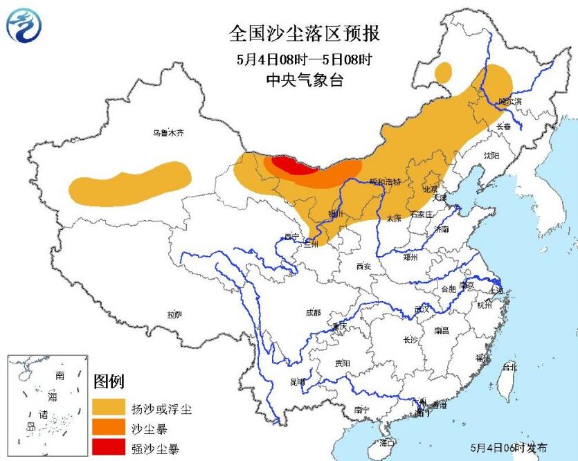 预计4日08时至5日08时,新疆南疆盆地、内蒙古中西部、甘肃中西部、宁夏、陕西北部、山西中北部、河北北部、北京、吉林西部和黑龙江西南部等地的部分地区将有扬沙或浮尘天气,其中内蒙古中西部等地的部分地区将有沙尘暴,局地强沙尘暴。