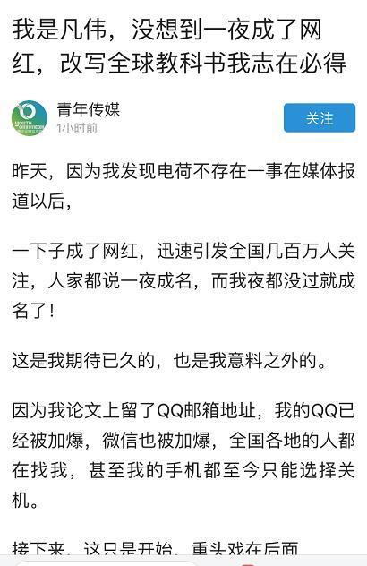 从5月6日下午开始,朋友圈被一篇文章名为《重磅,中国科学家发现电荷并不存在,将改写教科书》的帖文刷屏。文中称“来自中国云南大学的一名科学家(凡伟)发现电荷并不存在,经过一个多月的同行评审,相关论文和实验已经通过剑桥大学卡文迪许实验室,1973年诺贝尔物理学奖获得者约瑟夫森教授的评审。这意味着我国的科学家即将改写全球的教科书,这是我国科学家的胜利,也是基础物理学的胜利。同时,论文已经预先发表在中科院的科技论文预发布平台《chinaXiv》。”