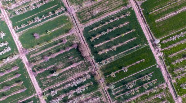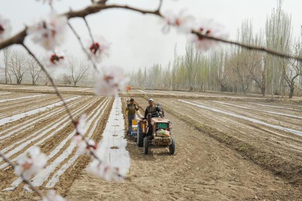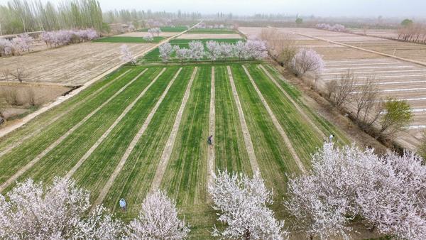 农民在麦田松土,两边是盛开的杏花树