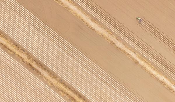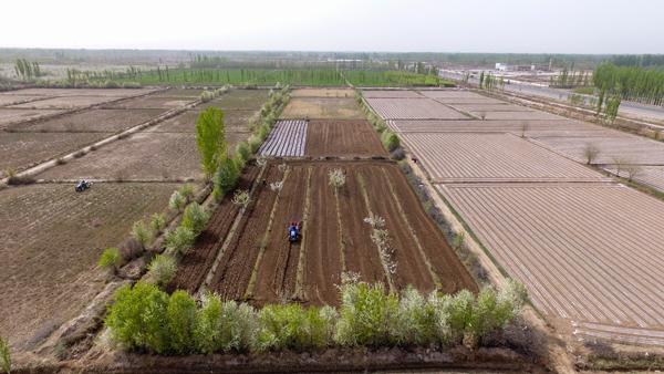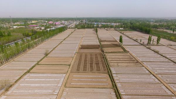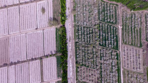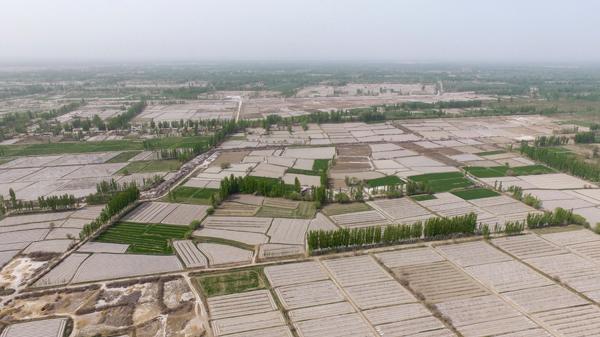 立夏前后,从高空俯瞰沙漠绿洲,纵横阡陌的田野,青翠的小麦,田里忙碌播种棉花的农民,交织出一幅幅别具一格的画面。