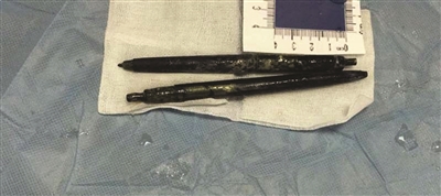 体内取出的两支圆珠笔。
