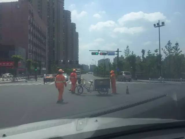 两个环卫工人正在丁字路口清扫残骸。