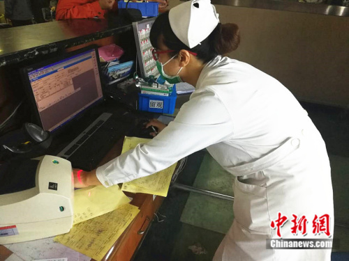 护士李伟正在核对患者的药物中新网记者 张尼 摄