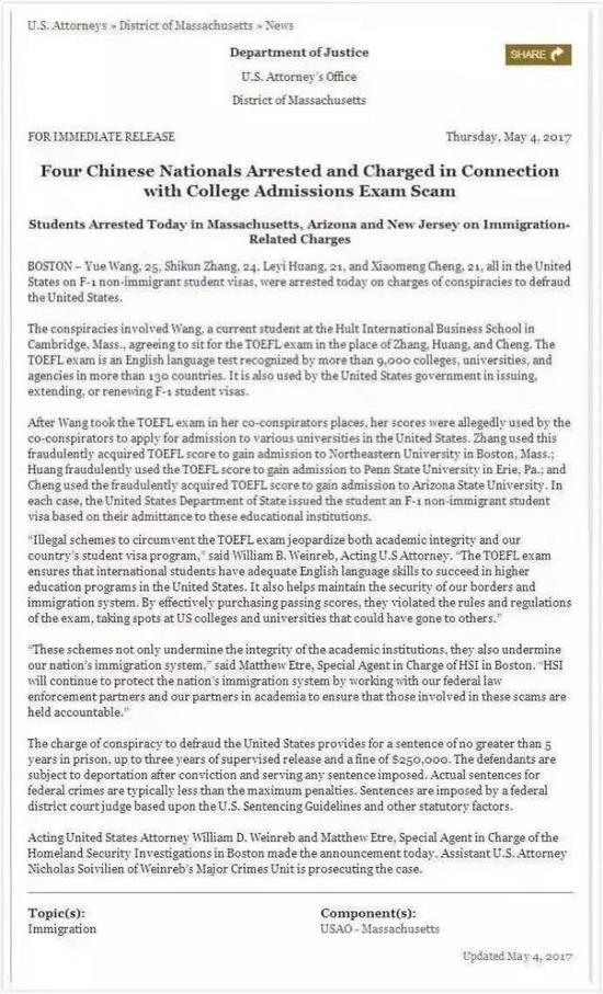 案件的代理检察官威廉·魏因雷布(William B· Weinreb)表示:非法获取托福考试成绩不但损害了学术诚信,而且破坏了美国移民制度。