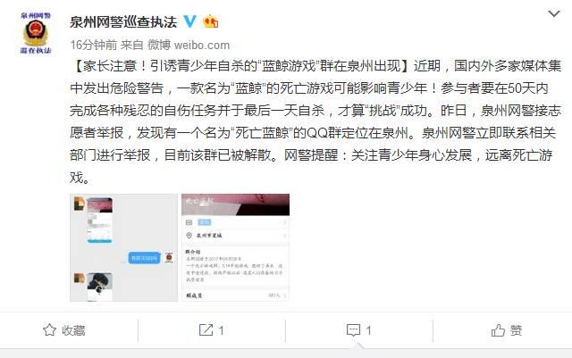 从5月10日至目前,全国31省区市(除港澳台)的公安网络安全保卫总队,已有15家通过官方微信公众号,发布相关提示,呼吁公众抵制“蓝鲸”死亡游戏,并及时举报。有的省市网警已开始对这款死亡游戏进行查删,并采取了解散相关QQ群等措施。