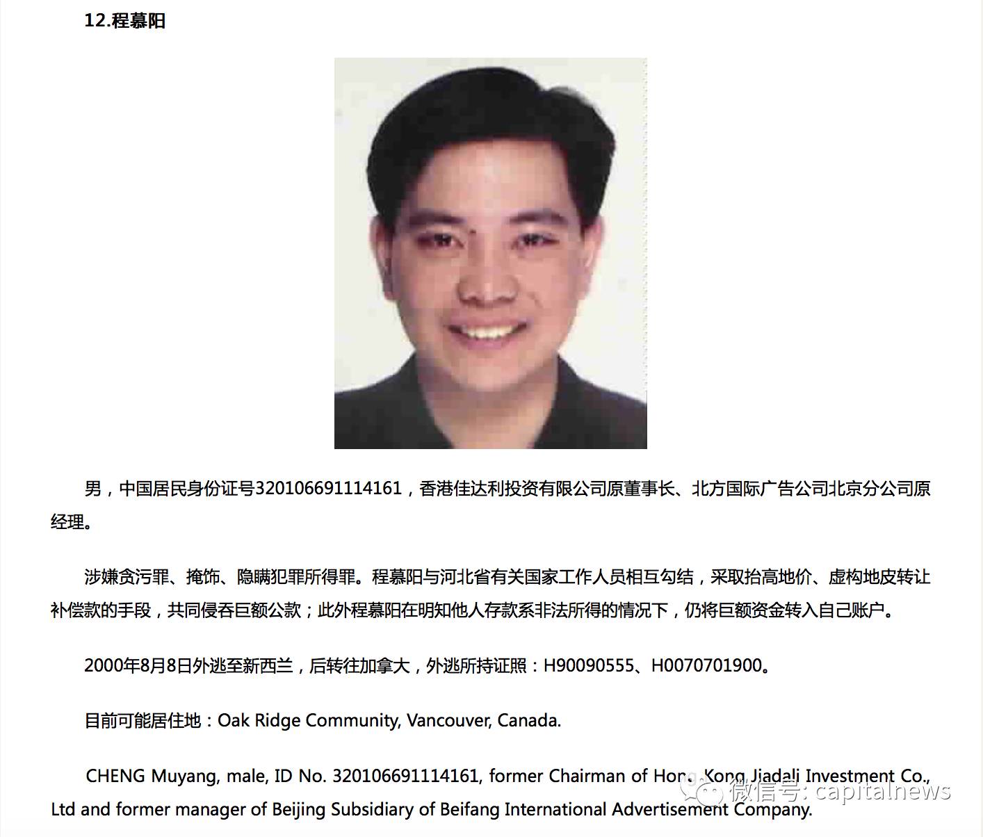 2015年4月22日,国际刑警组织中国国家中心局集中发布100份红色通缉令,程慕阳赫然在列,涉嫌罪名为侵吞、骗取国有资产,贪污等。几天后,加拿大温尼伯地方法院确认,温哥华房地产开发商迈克尔·程(Michael Ching)就是程慕阳!