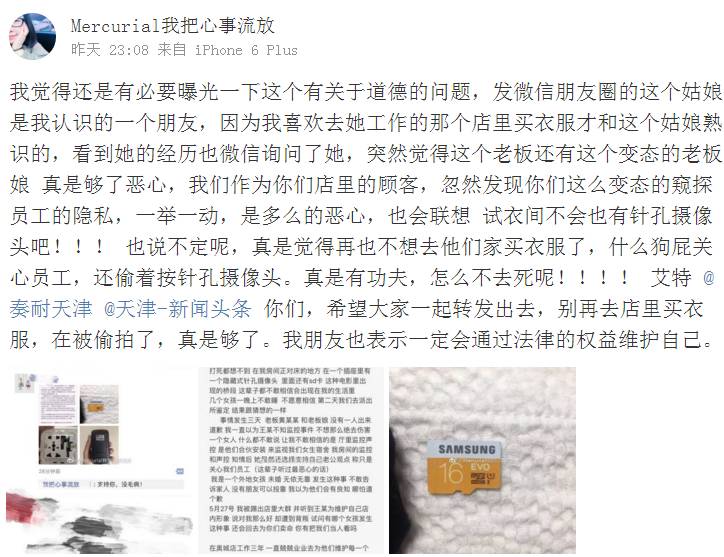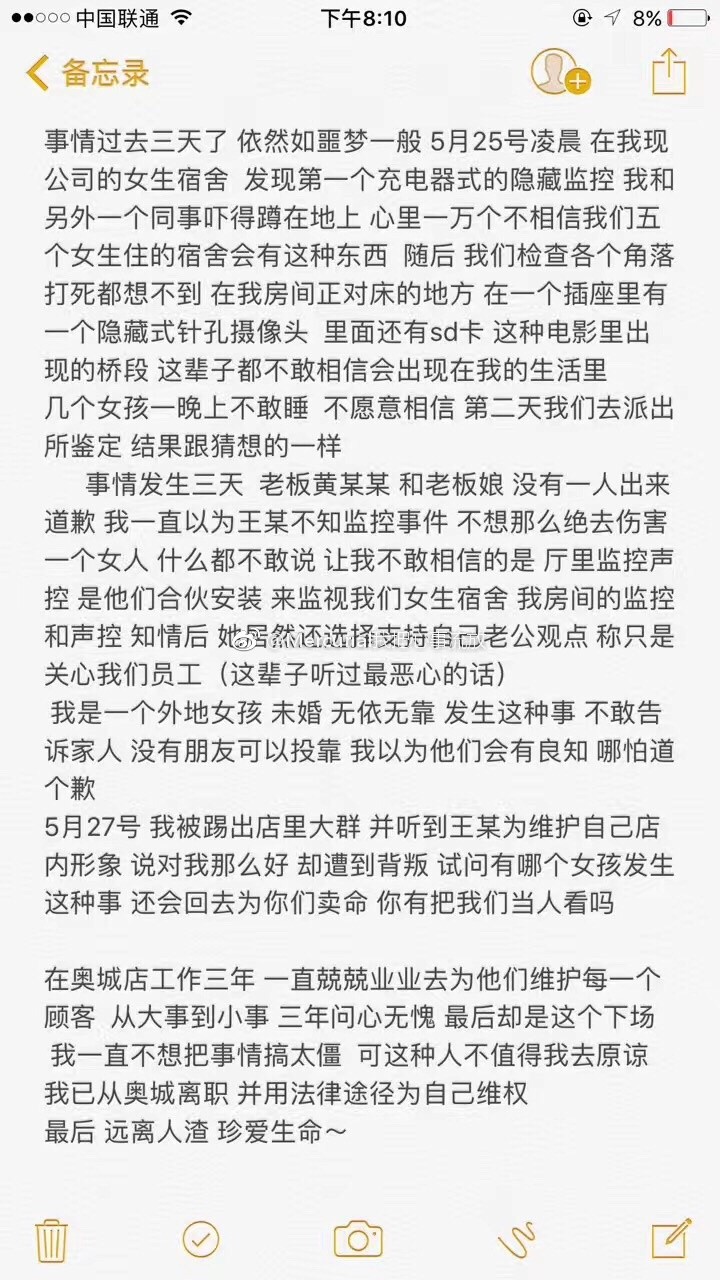 网友@Mercurial我把心事流放爆料,称其好友在工作期间老板在员工宿舍的电插门里安装针孔摄像头。最为奇葩的是还是老板和老板娘一起安装的,美其名曰是为了员工的安全....